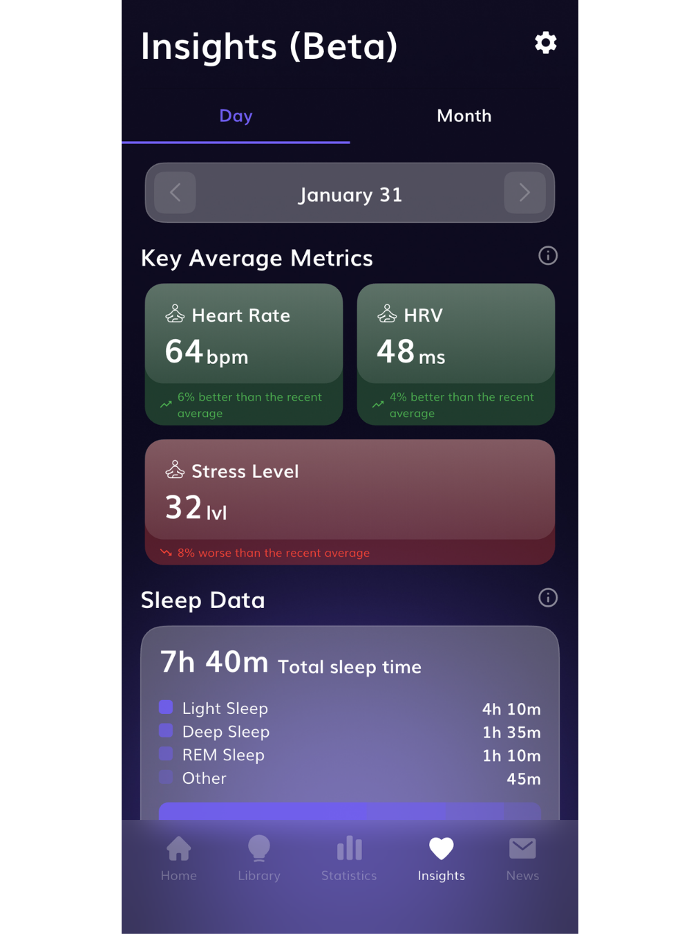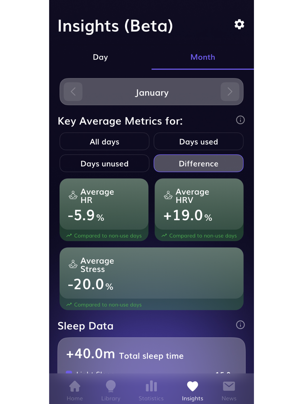 - Start exploring: Go to Insights in the app. In the Day view, see today’s averages and sleep data. Use the Month view to explore trends and the Difference comparison.