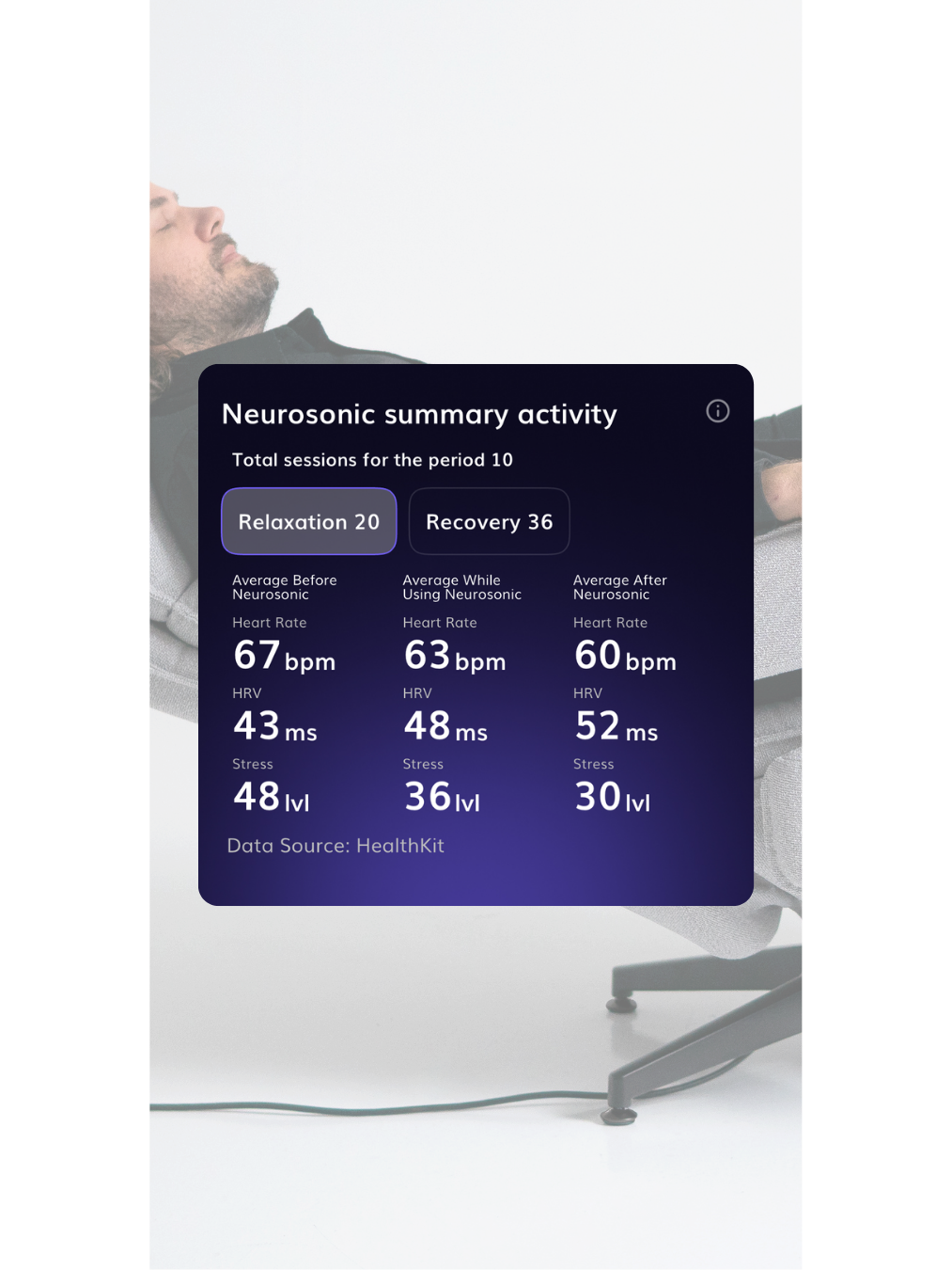The Neurosonic summary shows how a single Neurosonic session is reflected in your wellbeing data. It displays heart rate, HRV, and stress level: